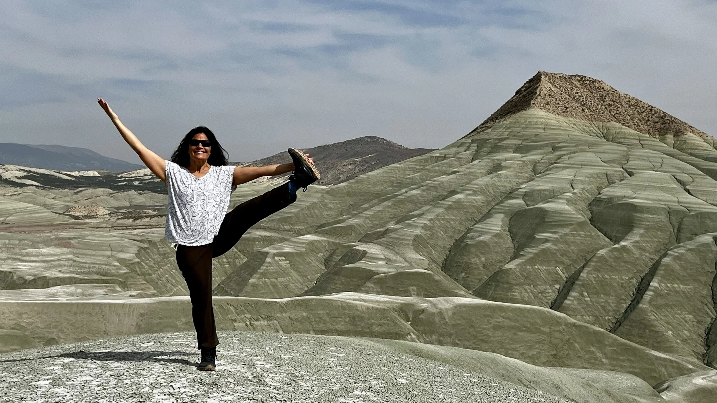 Image: I’m in a variation of a yoga asana (posture) called Utthita Hasta Padangusthasana (standing hand to big toe pose. In the backgorund are the Rainbow hills of Nallıhan, located near Ankara, Turkey.
