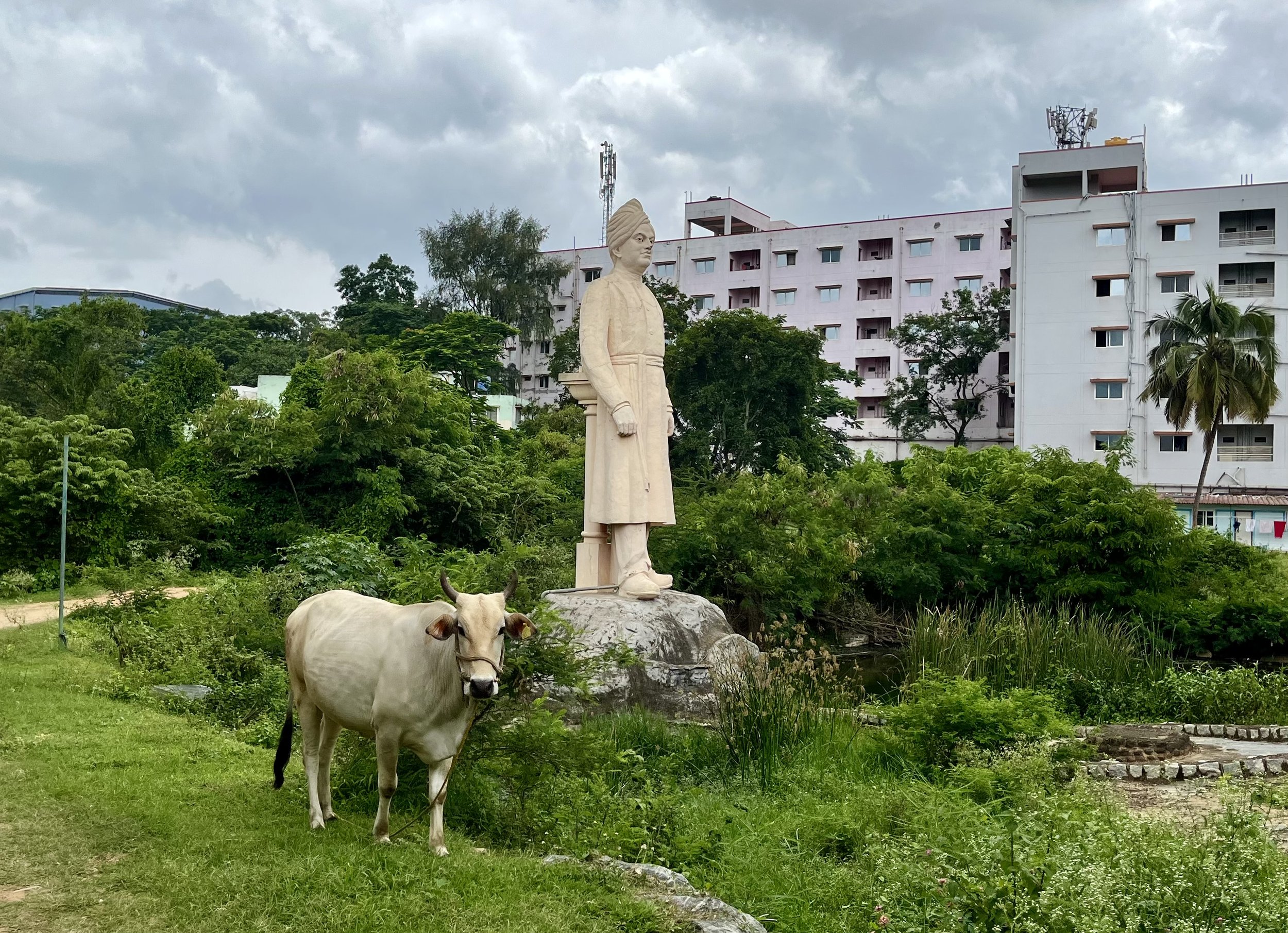 Image: A well loved cow visits the statue of Swami Vivekananda on campus.