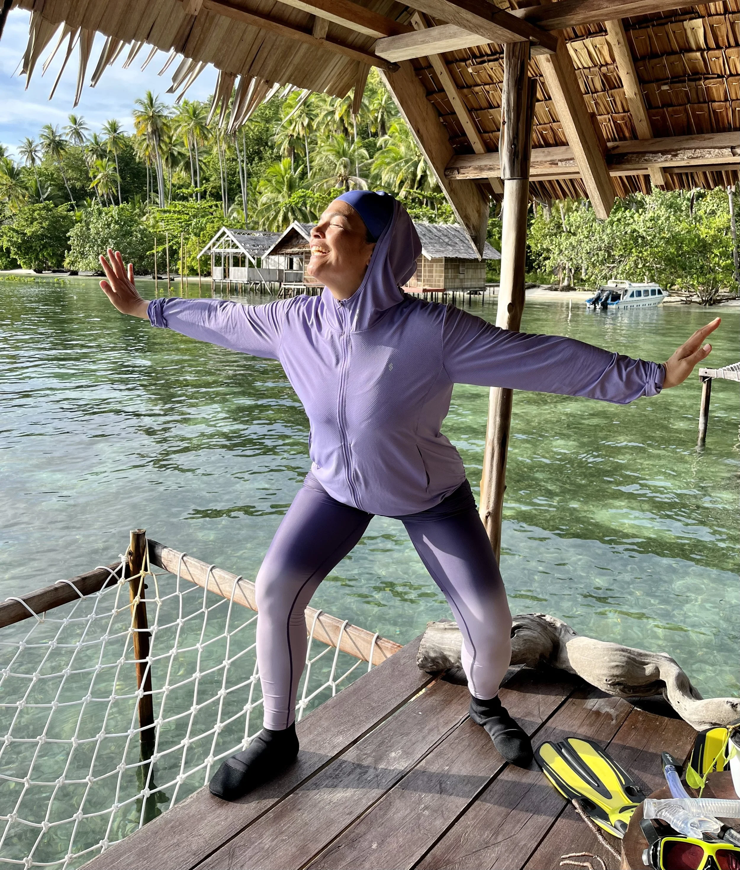 Photo: In this photo I’m pretending to be a stingray, wearing all my snorkeling sun protection gear at the “back door” of our bungalow homestay in Raja Ampat, Indonesia.